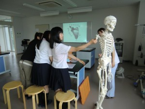初参加の皆さんには筋肉について、女子学生の皆さんには骨について、それぞれで模型を使いながら解説後、構造や機能について自分の身体を使って体験してもらいました。